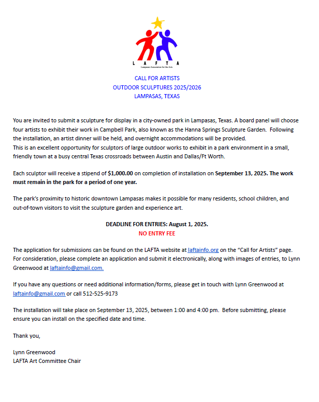 Every year the LAFTA board selects 3-6 sculptures for temporary display in the Hannah Spring Sculpture Garden. The information for the 2025 Call for Artists is below, along with the downloadable application.