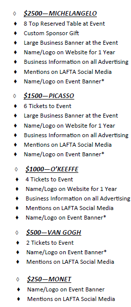 If you are interested in sponsoring the event, please contact a board member or email us at laftainfo@gmail.com. The sponsorship levels are: